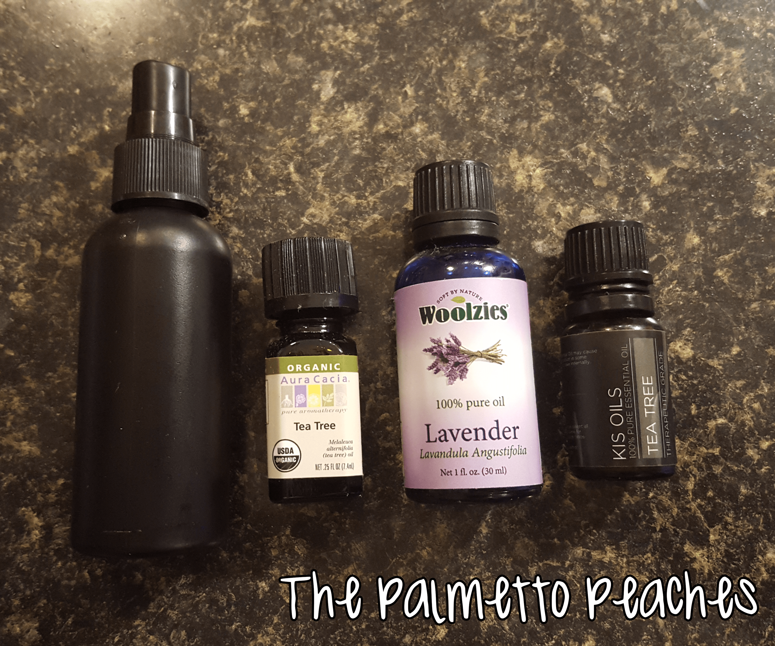 Spray bottle and put 1/4 cup witch hazel in then filled the rest with water and added 7 drops of tea tree oil. 3 drops lavender essential oil. Then, add a few drops of tea tree oil and mix well.